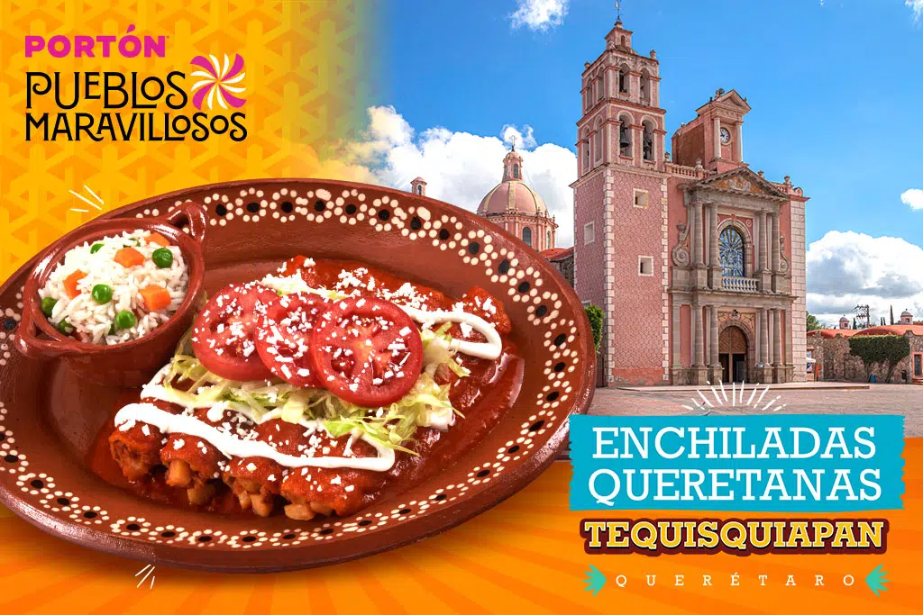 TEQUISQUIAPAN SE SABOREA EN SUS ENCHILADAS QUERETANAS Tequisquiapan es sinónimo de encanto, historia y buen vivir. Entre sus calles empedradas, casonas coloniales y plazas llenas de vida, este Pueblo Mágico queretano invita a perderse en su ambiente tranquilo y acogedor, donde el tiempo parece detenerse entre copas de vino, artesanías y sonrisas hospitalarias. Tequisquiapan es sinónimo de encanto, historia y buen vivir. Entre sus calles empedradas, casonas coloniales y plazas llenas de vida, este Pueblo Mágico queretano invita a perderse en su ambiente tranquilo y acogedor, donde el tiempo parece detenerse entre copas de vino, artesanías y sonrisas hospitalarias. Rodeado de viñedos y campos semisecos bañados por el sol, Tequisquiapan es un destino que combina el arte, la cultura y el sabor. Su cocina es un reflejo de esa mezcla perfecta entre tradición y calidez, y las enchiladas queretanas son una de sus joyas más representativas: tortillas bañadas en salsa roja, rellenas de pollo y acompañadas con papas, zanahorias y una generosa porción de queso fresco. Un platillo que conquista por su sencillez, pero también por su profundidad de sabor. Rodeado de viñedos y campos semisecos bañados por el sol, Tequisquiapan es un destino que combina el arte, la cultura y el sabor. Su cocina es un reflejo de esa mezcla perfecta entre tradición y calidez, y las enchiladas queretanas son una de sus joyas más representativas: tortillas bañadas en salsa roja, rellenas de pollo y acompañadas con papas, zanahorias y una generosa porción de queso fresco. Un platillo que conquista por su sencillez, pero también por su profundidad de sabor. En Portón, rendimos homenaje a este clásico con una receta que rescata su esencia casera y la comparte con el mismo espíritu de Tequisquiapan: cálido, familiar y lleno de sabor. Porque Tequisquiapan no solo se visita, se saborea —y en cada enchilada queretana de Portón, revivimos la tradición, el color y la alegría de este destino que celebra la vida a través de su cocina.